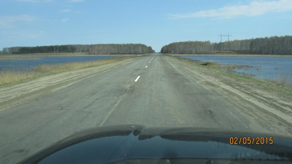 Вот на фото, судя по всему, талая вода в виде небольших озер как в тиски «сдавливает» дорожное полотно по левую и правую руку. Не удивлюсь, что данный участок дороги долго не проживет в таком первоклассном состоянии. Дорожное полотно очень низко расположено, а грунты, судя по-всему глинястые, так как зелень уже во всю проглядывает, а вода так и не ушла в почву.