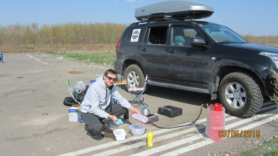 Разложили полевую кухню, доедаем котлетки куриные домашние ), предусмотрительно приготовленные дома за день до отъезда. Отвариваем гарнир, вроде как макароны, с салатиком из свежих помидор и огурчиков! Вкуснотища! Да, предварительно, поставили машину, так чтобы спрятаться от ветра. Солнце светит — аж слепит.