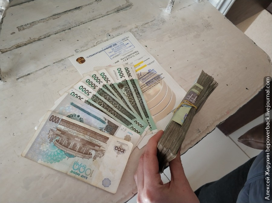 1000 сум = 22,84 рубля.Это одна из немногих стран, где кошелек - вещь совершенно бесполезная. Деньги носят в сумках и пакетах, а счет могут предъявить не в цифрах, а показав высоту пачки с купюрами - «с вас вот столько». Почувствуйте себя миллионером.