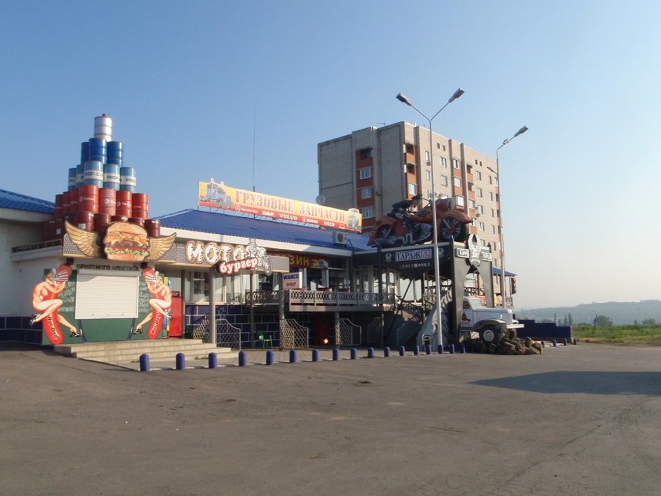 На следующее утро едем дальше. Во время каждой остановки проверяем колеса. На заднем появилась сначала одна, а затем другая грыжа. Как поведет себя скутер если вдруг лопнет колесо непонятно, а перспектива оказаться под проходящей мимо фурой нас нисколько не радует. Сбрасываем скорость до пятидесяти и медленно дотягиваем до Ростова-на-Дону. По пути встречаем вот такой вот пафосный байк-отель. Там наверное останавливаются серьезные байкеры.
