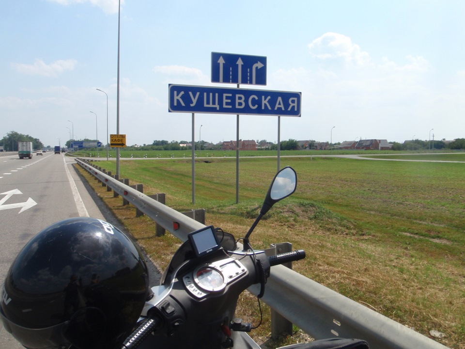 При въезде в город нас встречает авторынок. На авторынке есть павильон торгующий скутерами и запчастями, там нам выкатывают новенький Dunlop по вполне демократичной цене. На рыке же, в мотосервисе, меняем покрышку и весело катим дальше. Ростов-на-Дону проезжаем без остановок. Уже жарко, воздух просто горячий. От Ростова едем уже без курток, загораем и радуемся солнцу. Проезжаем печально известную станицу Кущевская,