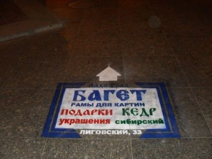 Особенно много «неприличных» надписей около станций метро и в спальных районах Петербурга. Самым дешевым видом рекламы на асфальте считаются «визитки» — одноцветное нанесение с названием сайта или телефоном в местах массового скопления людей обойдется заказчику от 200 до 300 рублей за каждую копию.