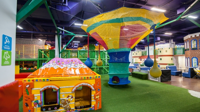 Множество лабиринтов, различного рода горок, батутов, активных игр - все это находится на третьем этаже торгового центра. Если вы подниметесь туда на центральном эскалаторе, то парк будет от вас слева.