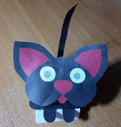 Вырезаем полоску из чёрной бумаги длиной примерно 5 см, а шириной – 3 мм. Кончик обрезаем так, чтобы получился уголок. Получился хвостик. Приклеиваем его к телу котика.
