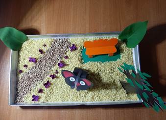 Практически всю территорию коробки я засыплю пшеничными хлопьями, а дорожку сделаю из гречневой крупы. Но вы можете взять другие материалы.