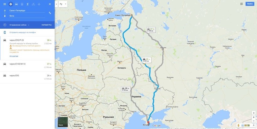 Дорога из Санкт-Петербурга займет около 30 часов. Есть варианты: ехать либо только через Украину, либо через Белоруссию и Украину. В среднем выходит 2 200 км. Если ехать только через Украину, то двигаться следует по трассе Е95, в Брянске выехать на Е101, по которой двигаться до Белгорода, а там сменить дорогу на Е105. Это самый оптимальный, простой