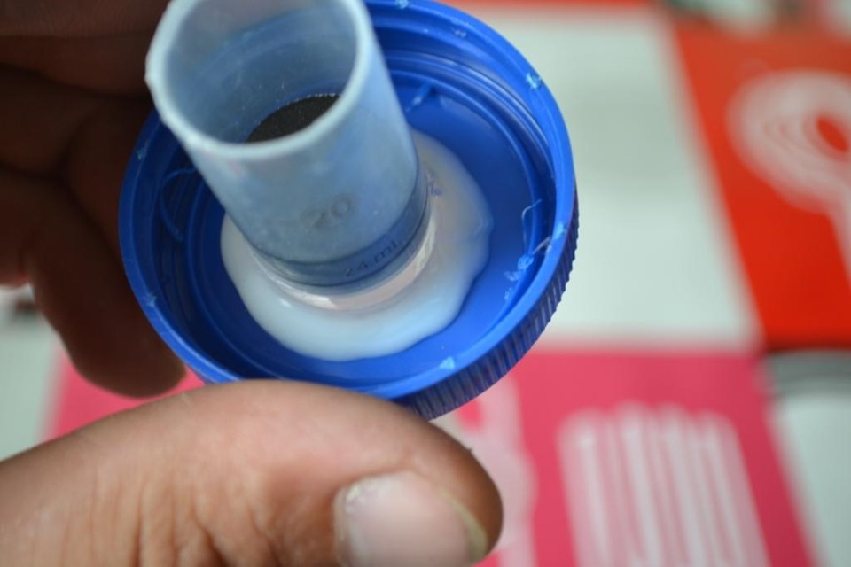 Вставляем шприц в крышку и наносим горячий клей на корпус шприца