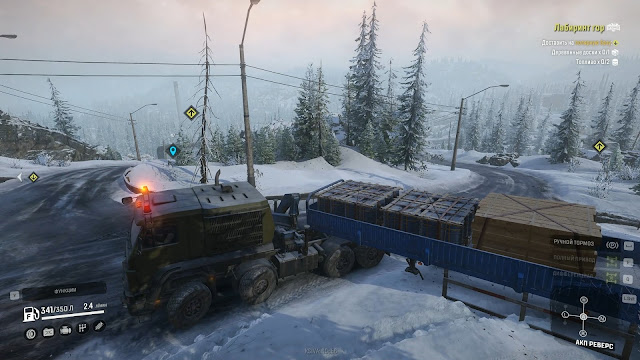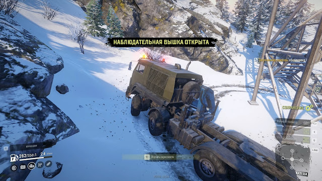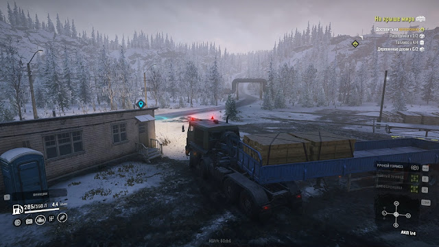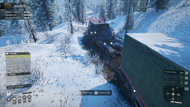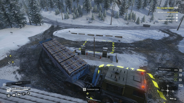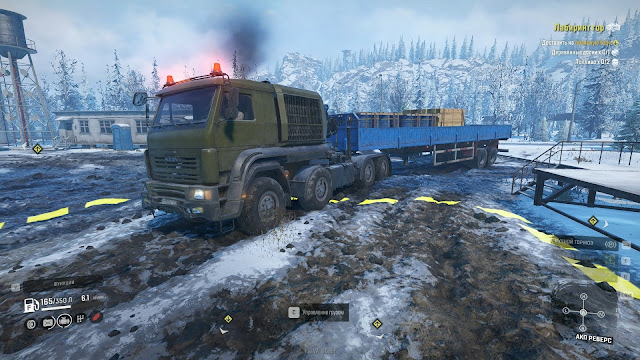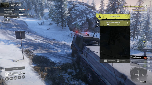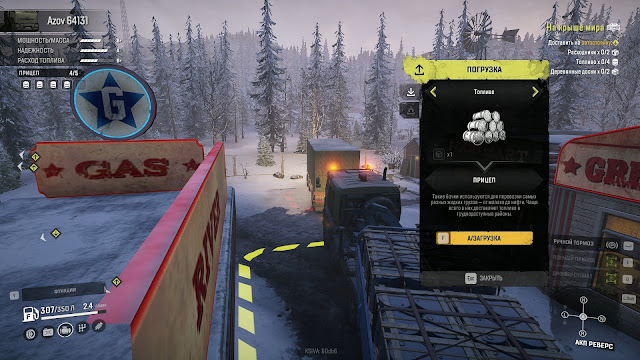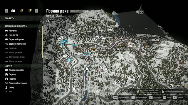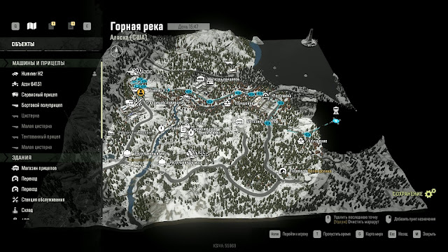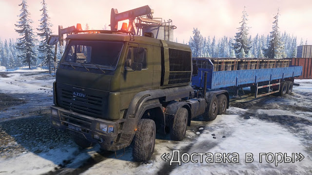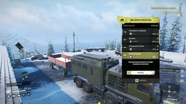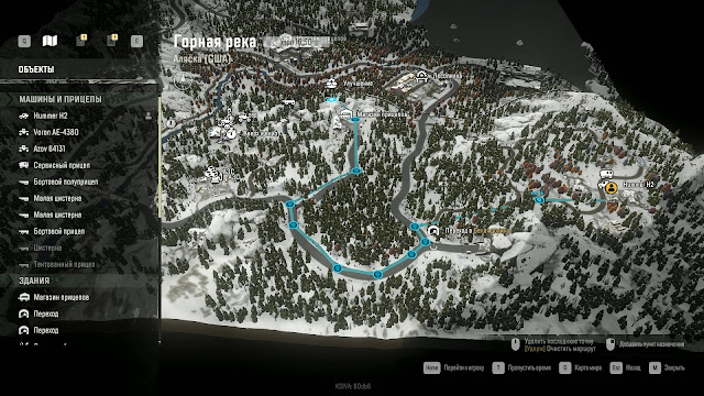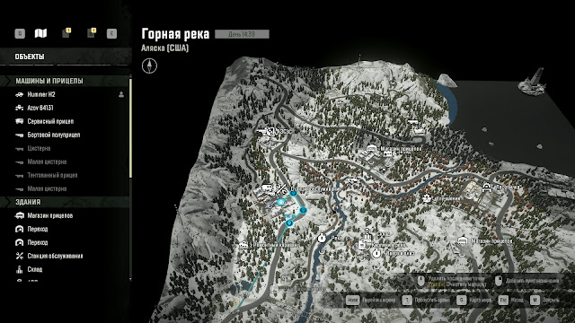 Перепрыгиваем в КАМАЗ, покупаем лебедку, ставим платформу, и погнали до карты "Горная река"