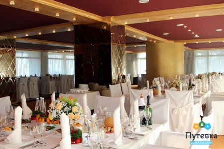 Для проведения свадеб, фуршетов, корпоративов и других торжеств предлагаются два банкетных зала, вмещающих до 200 персон.
