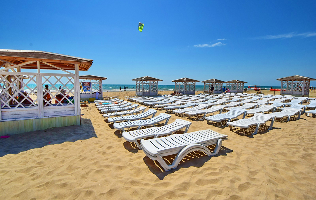 На собственном огороженном пляже с просторной береговой линией с удобными шезлонгами под навесами, а также пологим заходом в море, будет комфортно и детям, и взрослым. К тому же пляжные полотенца выдаются абсолютно бесплатно. На пляже имеется огороженная детская территория с горками, пляжный волейбол, а также снек-бар, медпункт, оборудованный спасательный пост и удобства.