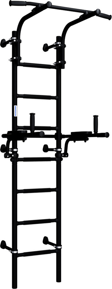Спортивный комплекс для дома Athleus Атлет P-4 на базе шведской стенки с турником для широкого, узкого и параллельного хвата и навесными брусьями для пресса. Цвет - чёрный. Для профессионалов и любителей.