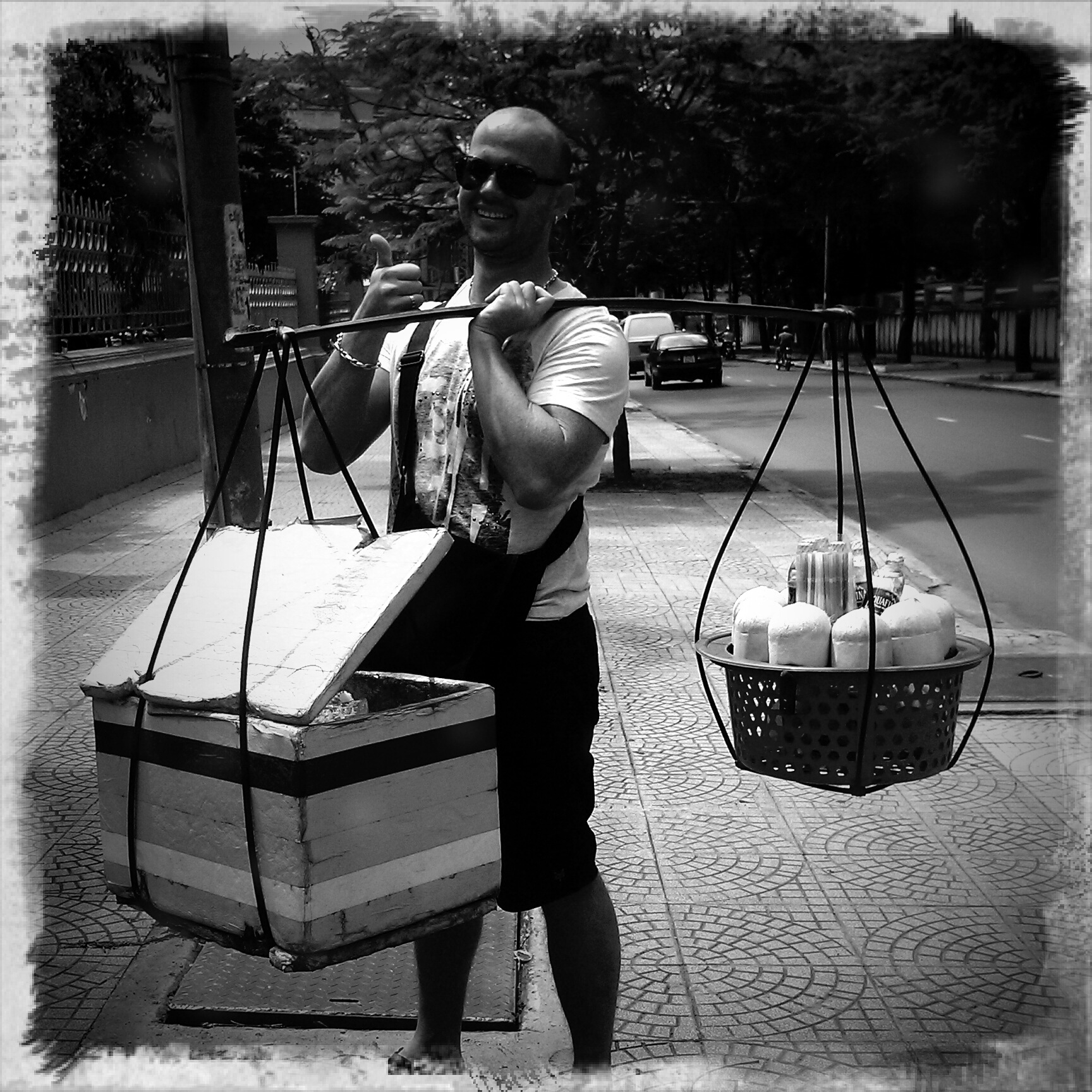Работа: Во Вьетнаме нет социальной пенсии — кроме военных и милиции (или полиции), значит остальной народ выживает как может. На фото я с двумя ящиками льда и кокосов — средний вес такой ноши около 40 кг, и им бедным мужикам — вьетнамцам приходится ходить с такой ношей целый день — 1 кокос стоит — около 1 доллара.
