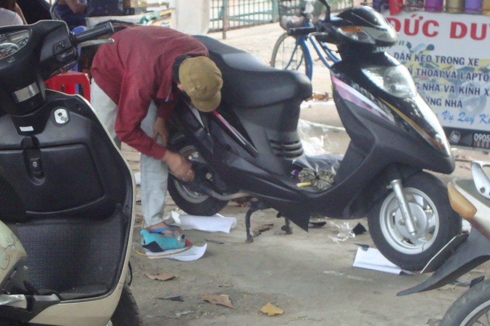 Вьетнамцы так же живут в ногу со временем, на фото — перетяжка матовым винилом. Всё делается на улице. Вроде хорошо сделал!