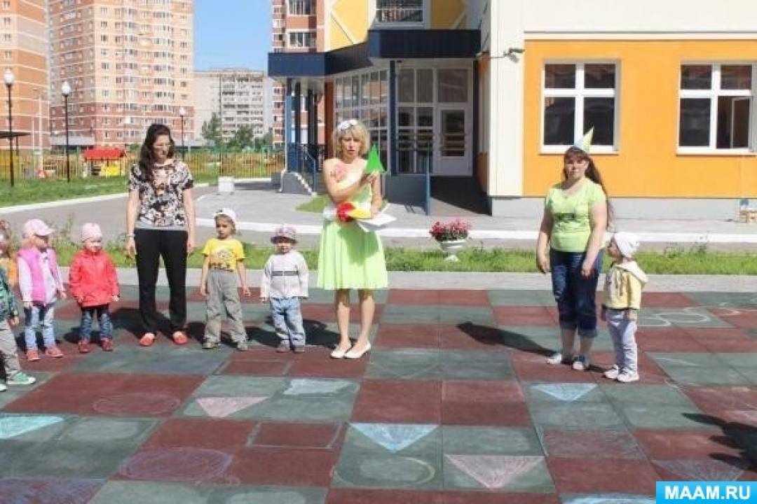 Подготовка: Заранее на площадке нарисовать фигуры разной формы и цвета, «гусеничка» из кружков по всей окружности площадки, а так же разметить для каждой группы место на асфальте, на которых дети будут рисовать коллективные работы.