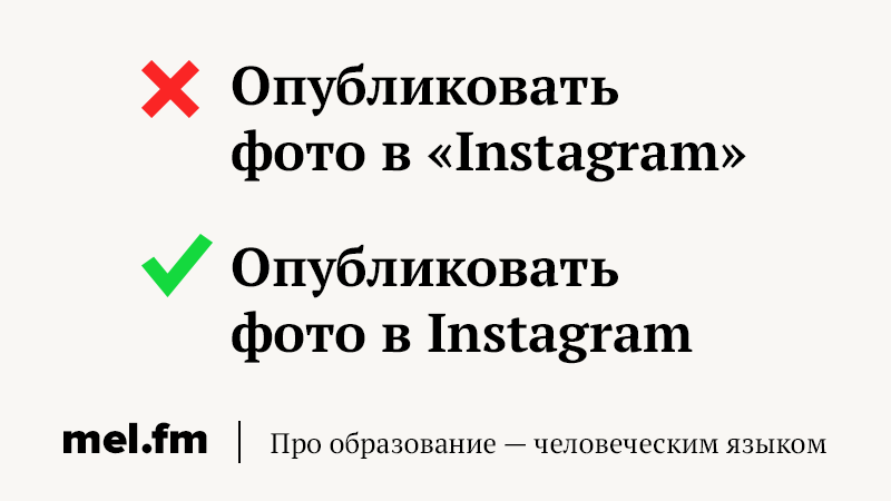 По правде говоря, такое написание встречается всё реже, в русском интернете как минимум, потому что зачем писать Instagram, если можно написать просто Инстаграм (и даже прописная буква под вопросом!). Но раз у нас тема пунктуации, скажем про кавычки. Названия латиницей по правилам русского языка не кавычатся: Instagram, Telegram, Facebook и так далее. А вот то, что написано кириллицей, уже ставим в кавычки: «Яндекс», «Википедия», музей «Гараж».