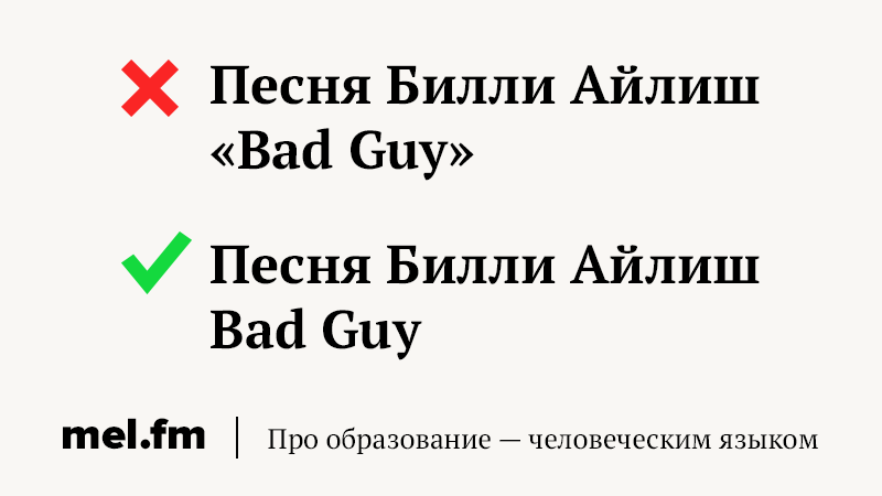 Закрепляем правило «название латиницей пишем без кавычек». Причём латинские буквы не подразумевают только английский язык. Не важно, песня это Билли Айлиш Bad Guy или Адриано Челентано Soli. То же самое про оригинальное название фильмов, сериалов или игр.