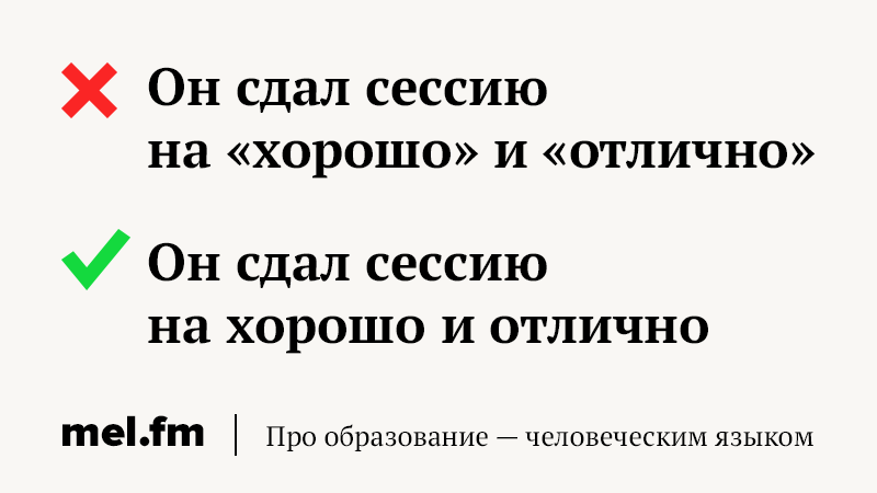 Правило, которое понравится школьникам и студентам. Слова, выражающие оценку, бастуют против кавычек. Получил пять или четвёрку, сдал экзамен на хорошо или отлично — пишем без кавычек. Но если в текст врывается родовое слово (получил оценку «хорошо»), кавычки снова в деле.