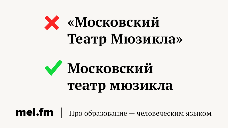 Имена собственные не всегда нуждаются в кавычках. Одни из самых популярных примеров — театры, музеи и вузы. Зачастую это единые сочетания, которые являются целиком именем собственным вместе с родовым словом. Например, Большой театр, Театр сатиры, Московский театр мюзикла, Русский музей, Московский государственный университет. При этом есть театр «Современник» или кинотеатр «Пионер». Как вы догадались, проверять надо в словарях (или на сайтах театров — заодно и билеты купите!).