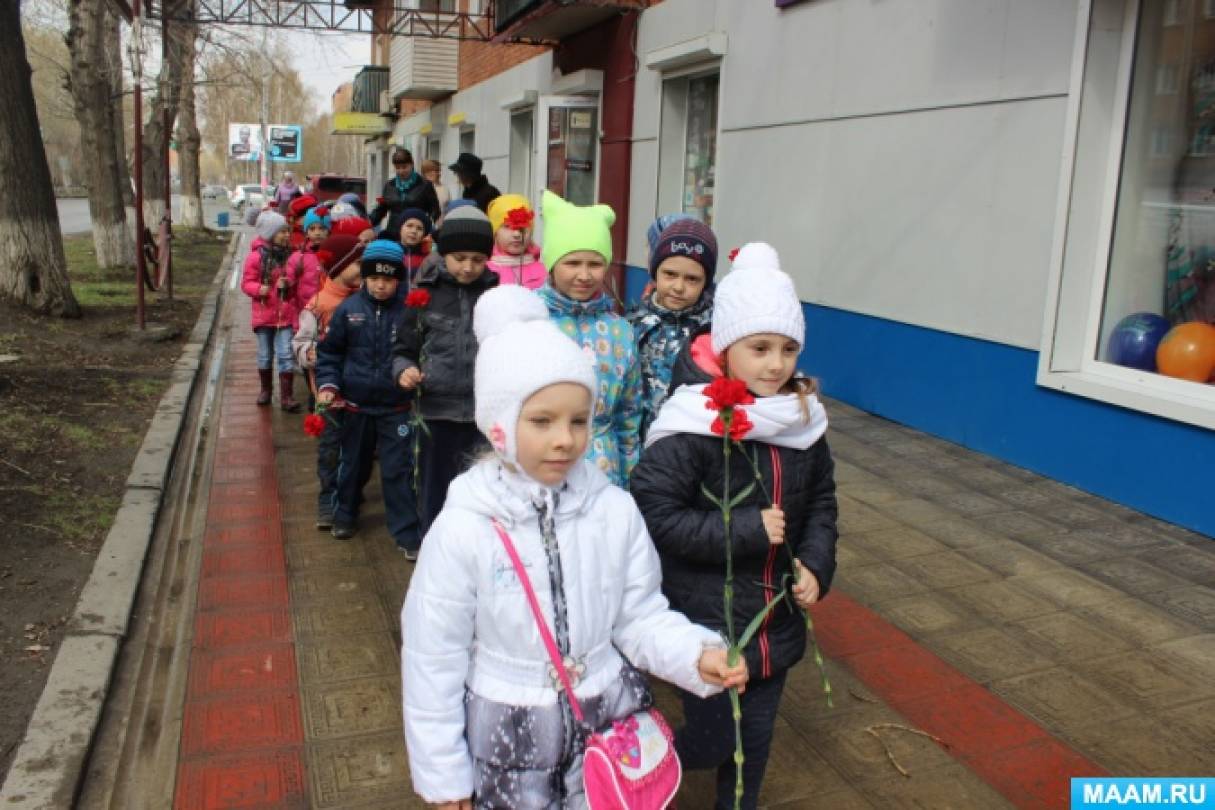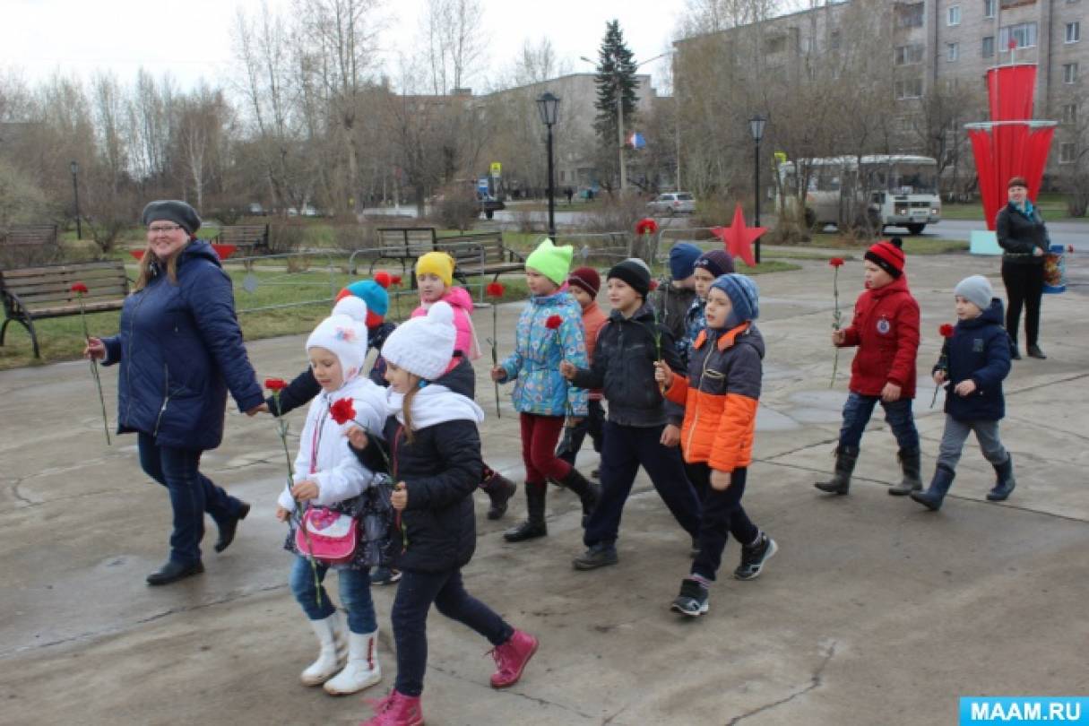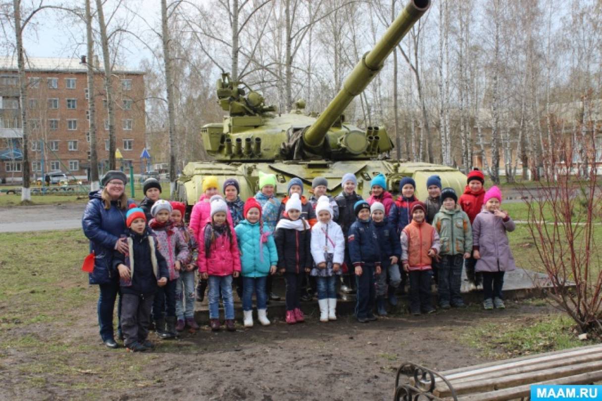 В преддверии Великого праздника – Дня Победы, на протяжении всей недели, с 02.05 по 05.05, педагоги рассказывали детям о Великой Отечественной войне, о нелегких боях, о трудных днях, о героических городах, которые мужественно боролись с немцами. Детям рассказывали о детях-героях войны, которые наравне с солдатами воевали на фронте, о людях, работающих в тылу и о том, каким нелегким трудом далась нашему советскому народу эта великая Победа. Война была очень жестокой, она принесла много горя и слез, разруху и голод. Но люди выстояли и победили. Война закончилась 9 мая, этот день стал в нашей стране великим праздником. Каждый год 9 мая в честь Великой Победы гремит салют. Благодарные люди поставили памятники воинам-освободителям. В нашем городе есть Мемориал павшим воинам-назаровцам, который 5 мая мы посетили с детьми и возложили цветы в память о погибших, защищая Родину. Ребята с большим интересом читали фамилии погибших на мемориальных плитах. Затем мы двинулись дальше. Побывали на центральной площади города, посмотрели как город готовится к празднованию 9 Мая, рассматривали баннеры, на которых изображены герои-назаровцы. Закончился наш поход по городу возле памятника Скорбящей Матери, возле которого стоит большой танк.