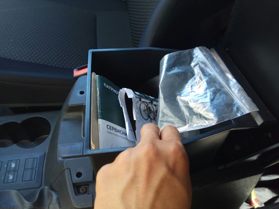 Но даже если жена предусмотрительно заберет всё, что найдет, в «Патриоте» полно тайников куда большего объема. Чтобы в них попасть достаточно просто открутить лючки для замены лампочек в задних фонарях, либо же достать «корыто», размещающееся под центральным подлокотником.