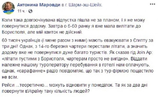«Когда такой долгожданный отпуск пошел не по плану, и я не могу вернуться домой. Завтра в 5:50 утра я уже должна была вылетать в Борисполь, но мой билет не действителен. 60 тысяч украинцев (и меня вместе с ними) должны эвакуировать из Египта за три дня! Однако, с 14 марта чартеры перестали летать, а значит домой уже не вернулись очень много туристов. Как сказал гид Join Ap: "летать пустыми из Борисполя чартерам просто не выгодно". Нужно отдать должное нашему туроператору — пребывание в отеле нам оплачивают, однако, "сарафанное радио" сообщает, что так с турфирмой повезло не всем. Рейсы . теоретически. могут восстановить в понедельник. И как за два дня вернуть Украине такое количество людей?» — подтвердила туристка Антонина Мавроди в Facebook.
