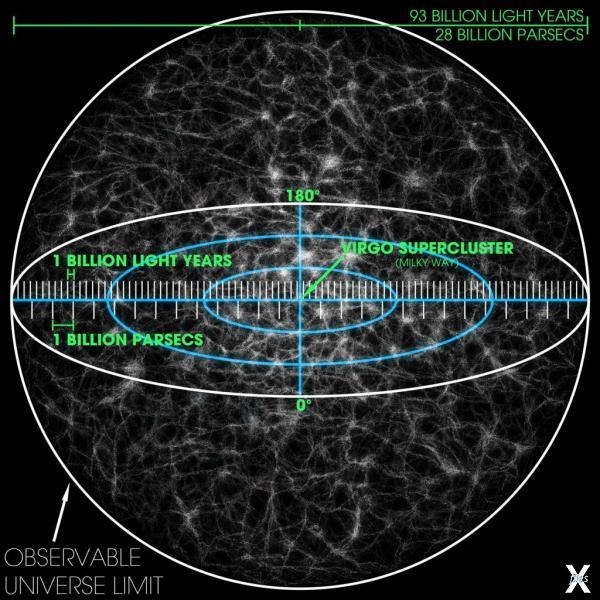 Но есть также то, что мы называем наблюдаемой вселенной, которая является частью пространства, которую мы можем реально видеть. Край этого места находится там, откуда свету не хватило времени, чтобы добраться до нас с начала существования вселенной. Мы можем увидеть только такой край, а за ним, вероятно, будет все то же самое, что мы видим вокруг: сверхскопления галактик, в каждой из которых миллиарды звезд и планет».