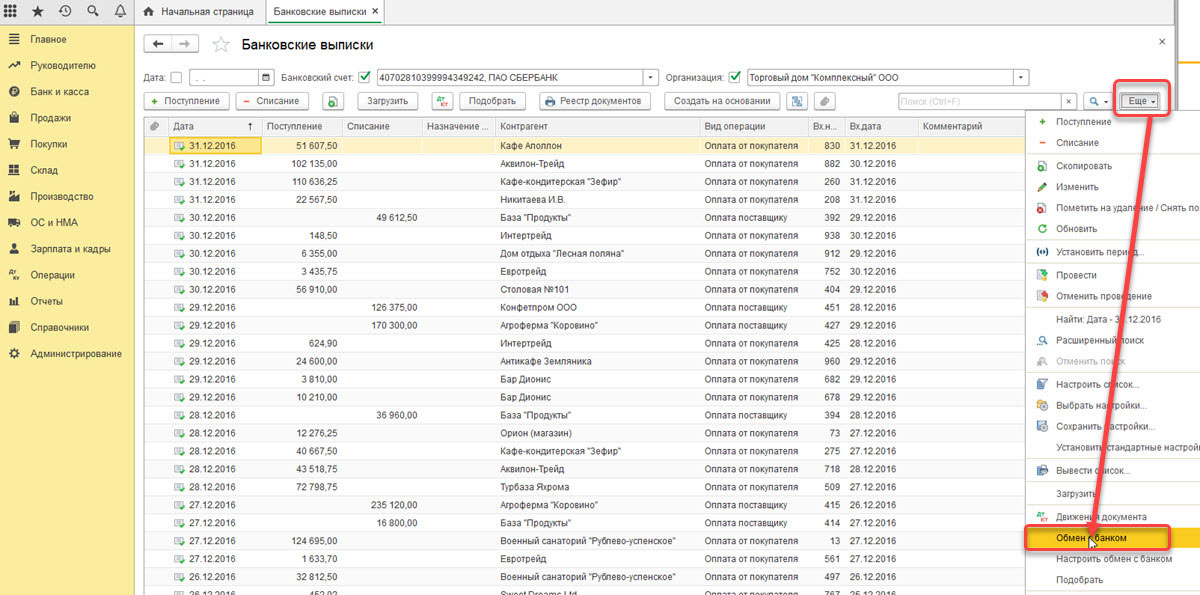 - задать список по конкретной организации, контрагенту, дате или банковскому счету.