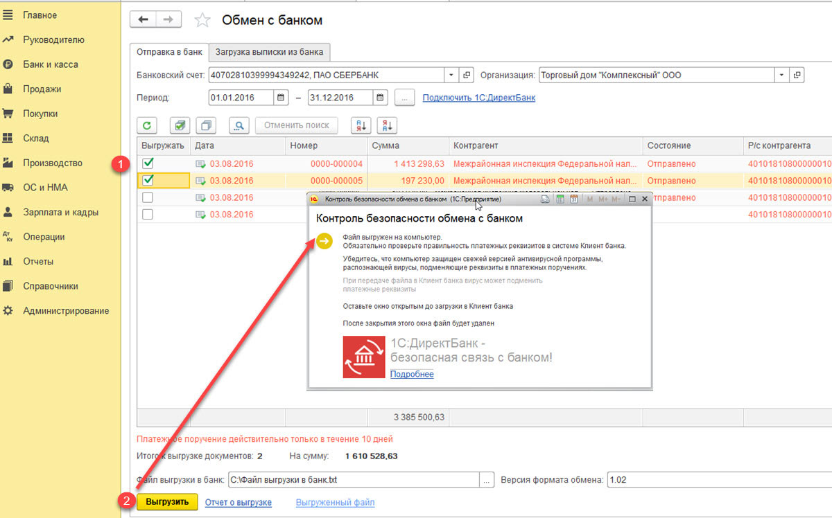 На этом этапе сформируется файл формата «1С_to_kl.txt». Его необходимо загрузить в банк-клиент. Отчет о выгруженных платежных документах отражается в окне «Обмен с банком». Далее необходимо выбрать «Отчет о выгрузке». Отчет будет содержать платежки, выгруженные в файл для последующей загрузки в «банк-клиент». Доступна опция печати или сохранения в любом формате.