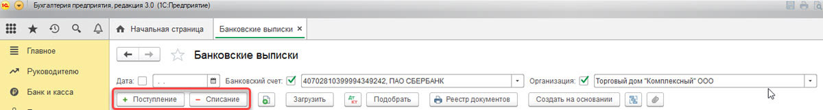 Первый способ предполагает использование блока «Банк и касса – Банковские выписки». В сформированном журнале будут отражены все операции по поступлению и списанию со счетов. Для удобства можно задать фильтры.