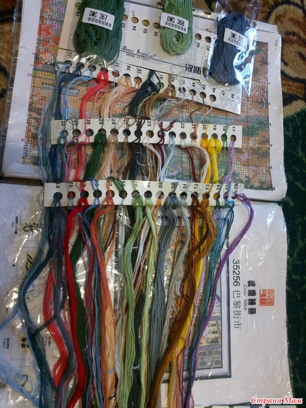 Схема удобная, разделена на 8 листов формата А4. Ниток осталось больше чем достаточно. Конечно, на вторую работу не хватит, запасы остались приличные)) Только парочку цветов осталось буквально по 4 ниточки