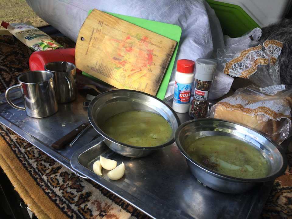 Если Вы при этом игнорируете придорожный общепит, ставя ставку на самостоятельное приготовление пищи, то надо делать ещё большую поправку при выборе времени остановки на ночевку. Ибо, за пол-часа приготовить пищу, поесть, убрать посуду и приготовиться ко сну вам не удастся. Уйдет на это часа полтора-два. Итого, за день на стоянки, включая ночной сон, уходит до 14 часов. На собственно путешествие остается менее 9 часов (не забываем про заправки, «санитарные» остановки, просмотр и фотографирование знаковых или просто красивых мест). Учитывая, что за счет трафика федералок Западной Сибири и Европейской части России вы вряд ли сможете держать среднюю скорость выше 80 км/ч, при означенном режиме дня о пробегах в 900-1000 км придется только мечтать. Увеличить среднесуточный пробег в связи со значительным отставанием от графика путешествия мы смогли только путем периодического отказа от готовок полноценного обеда и замены его на перекус, состоящий, как правило, из молочных продуктов и бутербродов из мясной гастрономии.