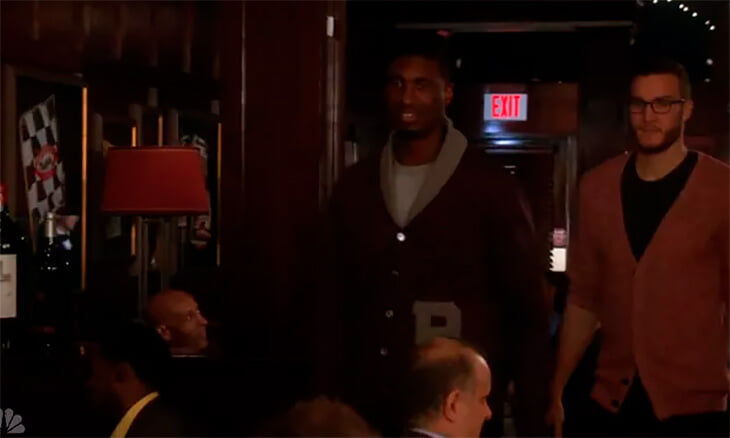 Но и это еще не все! Когда все мужские персонажи сообразили, что ни у кого из них не было мальчишника, они решили отметить сразу все в один вечер. Это событие могло быть признано несостоявшимся, если бы не появление все того же Хибберта в компании с другим звездным центровым «Индианы» Майлзом Пламли, который сражает наповал роскошным вязаным жилетом.