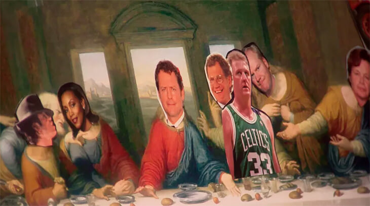 В «Парках» не только герои, но и задания интересные. Однажды нашим ребятам из любимого департамента было дано задание разработать новую фреску, символизирующую город и штат, чтобы ее можно было повесить в здании администрации. Логично, а кому еще можно это поручить, если не специалистам по паркам и озеленению? Донна Мигл выдумала замечательно – переделала «Тайную вечерю», заменив известные всем лица на физиономии знаменитостей Индианы. Понятно, что в компании с Дэвидом Леттерманом и другими там оказалось и главное божество штата. Ну, вы поняли.