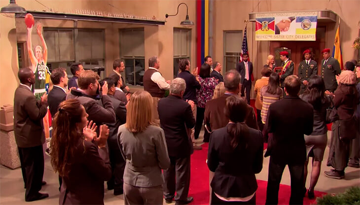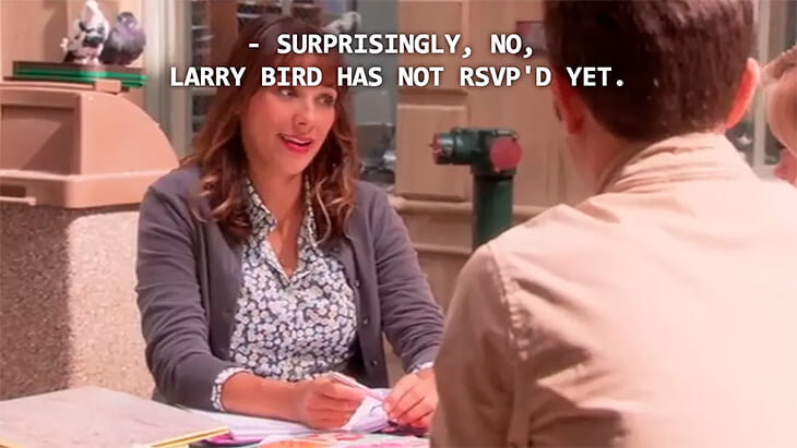 Составляя список гостей на свою свадьбу, Лесли, конечно же, не могла не подумать пригласить Лэрри Берда. Ну вот такая она, Лесли Ноуп, привыкла добиваться своих целей. Кстати, в одном из эпизодов Бен Уайатт сравнил ее выступление в безнадежно болезненном состоянии перед Городским Советом со знаменитой «Flu game» Майкла Джордана – вот вам еще одна требуемая реминисценция.