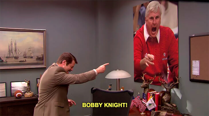 Первая лежит прямо перед глазами – в дебютном же эпизоде. Слово Рону Свонсону: «Мой офис – баскетбольная площадка. Я не хочу видеть никаких двойных ведений, никаких нарушений «Правила трех секунд». После этой фразы, как бы подчеркивая ее, Рон делает фирменный жест Бобби Найта перед постером Бобби Найта.