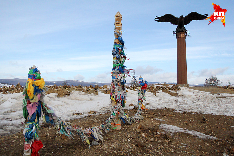 Пару лет назад в Ольхонском районе появился необычный памятник. Орел будто застыл в небе над байкальской землей. Размеры изваяния внушительные: 9 метров в высоту и 4 в ширину. Бронзовую скульптуру здесь поставили неслучайно. Все местные жители знают, что остров этот - земля шаманов, а они орлов особо почитают. Культ этого пернатого хищника у местных жителей один из самых древних.