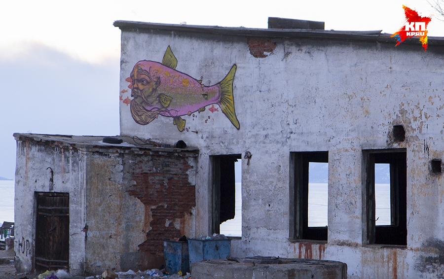 Только внимательный турист сможет во время прогулки по острову, заметить на бывшем здании рыбзавода такой рисунок. Креативные ребята, ничего не скажешь.