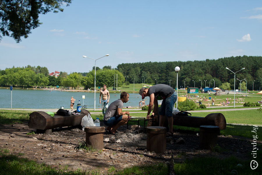 На пляже сотни людей. Прогулявшись вдоль берега, понимаем, почему многие выбрали именно это место недалеко от МКАД. Тут прекрасная инфраструктура. Работают кафе и спасательная станция. Есть деревянные лежаки, скамейки, беседки, установлены мангалы. Возле контейнерных площадок опять-таки идеальная чистота. Специалисты Минского лесопаркового хозяйства убирают ежедневно.