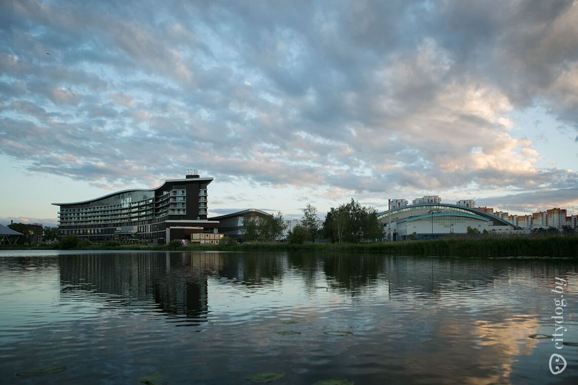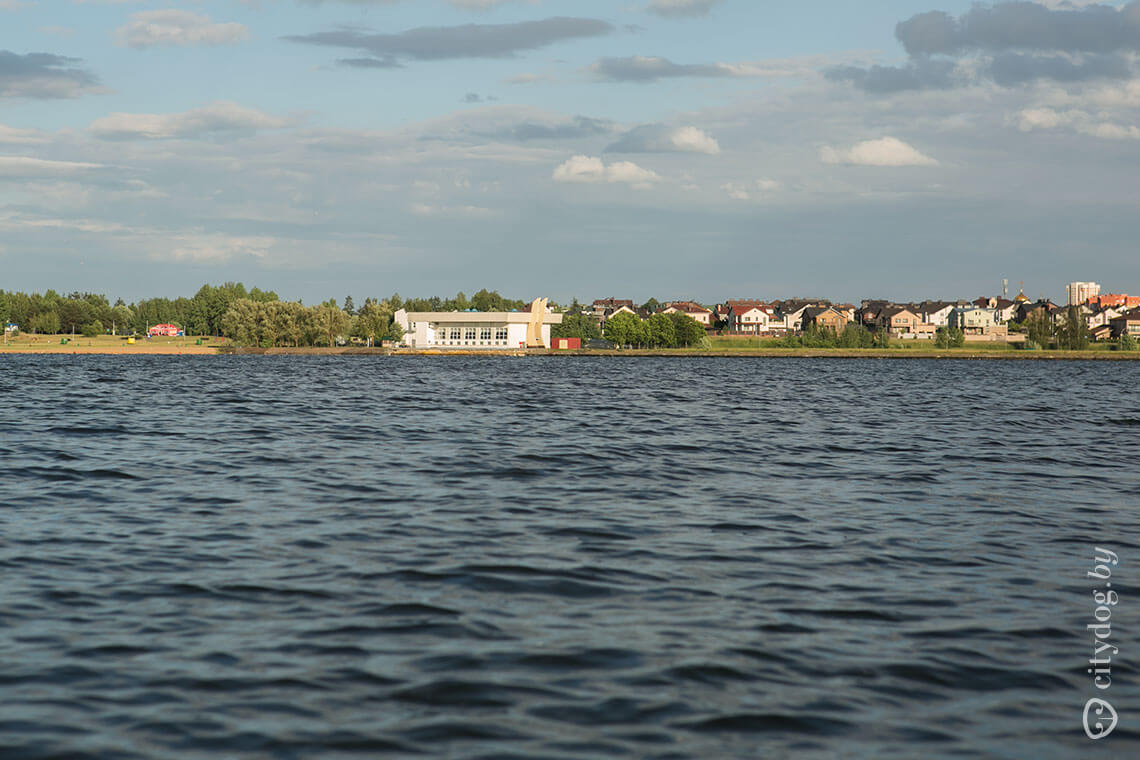 - На одном берегу озера высятся многоэтажки и роскошные коттеджи, располагается знаменитая Минск-Арена и супермаркеты;
