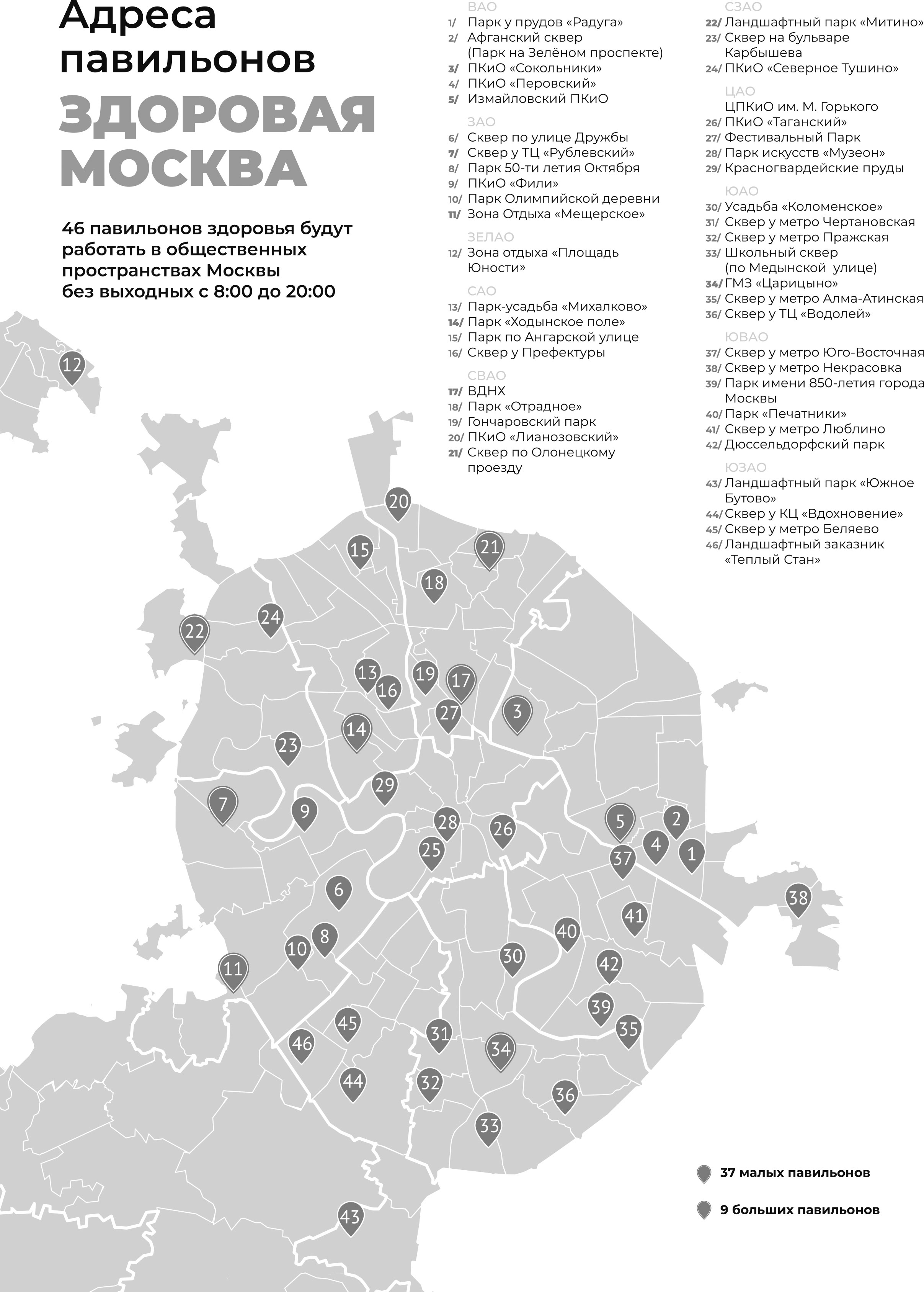 Павильоны «Здоровая Москва» открыты без выходных и перерывов на обед, с 8.00 до 20.00. Кабинеты и процедурные работают с соблюдением всех санитарных и ковидных норм. Посетителям нужно надевать маски и перчатки.