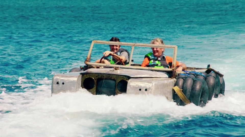 Заставив плавать старый Land Rover, они буксируют его с помощью водного скутера. Также, ведущие добавили известняка на обшивку машины, чтобы было больше питательных веществ для образования рифа. За рулем скутера находится Джереми, и ему не нравится, что надо плыть медленно, ведь если он поплывет быстрее, то Джеймс и Ричард пойдут ко дну. В этот момент мимо проплывает гоночный парусник. Кларксон решает погоняться с ним и отцепляет коллег от скутера. Нагонявшись вдоволь, он возвращается и, наконец, буксирует Land Rover на место. Успешно потопив его, трио с чувством выполненного долга возвращается в студию! Приятного просмотра!