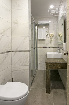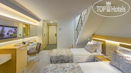 Отель хороший, свежий, номера чистые, не обшарпанные, все работает исправно. У нас был семейный номер на 5 человек, двухэтажный. Внизу три раздельные кровати, наверху большая двухспальная. На каждом этаже. Подробнее