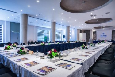 Открыт в 1995 году, последняя реновация прошла в 2004 году. Отель состоит из основного 2-этажного здания (только ресепшн), шести 3-этажных корпусов (первая линия) и комплекса 2-этажных вилл (вторая линия). Всего в отеле 392 номера. Front Area (первая линия): 173 standard room (вид на сад или бассейн, макс. 2+2 чел., 28 м2), есть Standard Sea View Room (частичный вид на море, макс. 2+2 чел., 27 м2), 73 Deluxe Top Floor Room (вид на сад или бассейн, спальня с зоной гостиной, балкон, ванная комната с ванной, 26 м2), 16 Hilton Deluxe Plus (частичный вид на море, спальня с зоной гостиной, балкон, ванная комната с ванной, 26 м2), 12 Diplomatic Suite (вид на сад или бассейн, однокомнатный, ванная комната с ванной, душ, балкон или терраса, макс. 2+2 чел., 30 м2), 2 Royal Suite (спальня, гостиная, ванная комната с джакузи, душ, макс. 2+2 чел., 107 м2), 4 Corner Suite (вид на бассейн, спальня с зоной гостиной, ванная комната с ванной, душ, балкон, макс. 2+2 чел., 38 м2), а также 2 номера для инвалидов, номера для некурящих и connected room. Villa Area (вторая линия): 102 Garden Room (в некоторых номерах есть мини-кухня, макс. 2+2 чел., 21 м2), также есть 10 Family Suite (две спальни, гостиная, ванная комната, в некотрых номерах есть мини-кухня, макс. 3+2 чел., 50 м2). К оплате принимаются кредитные карты: Visa, MasterCard, American Express, Diners Club Размещение с животными: до 4 кг (по запросу, платно)