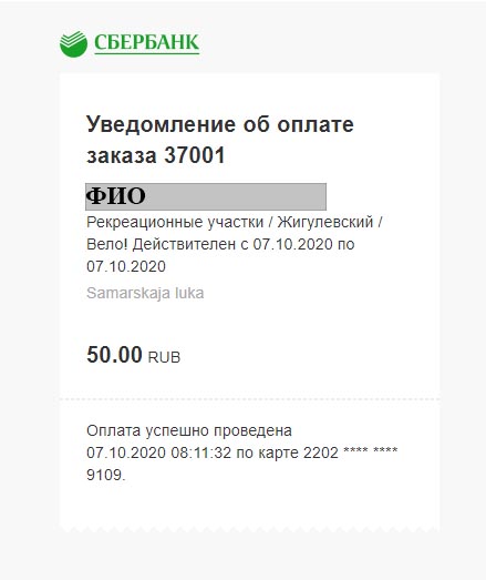 После внесения оплаты, на электронную почту, указную Заявителем, от сервиса Сбербанк поступает разрешение на право пребывания на территории национального парка в виде уведомления об оплате заказа, с указанием да нных, выбранных вами при оформлении разрешения (ФИО, участок, способ посещения, дата, сумма).