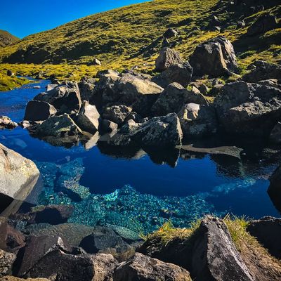 Сходим к студеному Серебряному источнику, который появляется здесь только в начале июля из-за таяния ледников. Здесь особо закаленные могут с визгами искупаться — остальные участники группы с удовольствием фотографируют процесс :)