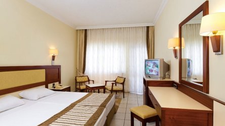 На турецком побережье Средиземного моря, вплотную примыкая к просторному, полностью оборудованному пляжу разместился прекрасный Sural Hotel 5*. Живописная территория отеля, обсаженная пальмами и субтропическими растениями, окружает большой плавательный бассейн. Есть пара водных горок. На пляже аккуратные ряды шезлонгов под навесами от солнца, все виды водных и спортивных с развлечений. Стильно оформленные номера подключены к центральному кондиционеру. Имеется телевизор, добротная деревянная мебель, мини-бар, который пополняется только питьевой водой. Ванная комната обеспечена феном и туалетными принадлежностями. С балконов открывается прекрасный вид на морскую даль или сад. Предусмотрено отопление. В заведении 6 баров, где можно заказать напиток или коктейль по своему вкусу. Ресторан работает по концепции все включено, предлагая «шведский стол» из лучших яств международной и турецкой кухни. В ассортименте буфета учтены детские предпочтения. Крытый бассейн под стеклянной крышей. Гостей развлекают аниматоры. Большой популярностью по вечерам пользуется амфитеатр и дискотека. Один раз в неделю живая музыка Турецкой Ночи. Для маленьких гостей приготовлен открытый и крытый детские бассейны, клуб и площадка для игр. Теннисный корт освещается в темное время. После насыщенного дня приятно расслабиться в сауне, турецкой бане или принять восстанавливающий силы и молодость массаж. Есть услуга аренды автомобиля. Отдых в этом отеле больше всего подойдет семейным парам и любителям активного отдыха.