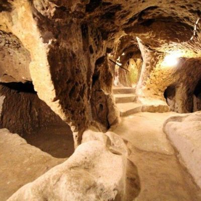 - Сначала мы окажемся в самом известном подземном городе Каппадокии — Деринкую. В Каппадокии существовало более 30 подземных городов, но раскопаны лишь несколько из них. Это настоящий мегаполис: на данный момент в нем раскопано 11 этажей, уходящих под землю на глубину 85 метров, для посещения открыты 4 этажа. Город мог одновременно вместить до 50 000 человек, со скотом, запасом провизии на несколько месяцев, часовней, винодельческими, гончарными и другими необходимыми мастерскими. Мы прогуляемся по узеньким тоннелям, увидим, каким был быт древних христиан, проникнемся его уютной и таинственной атмосферой.