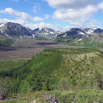 Начинается самая впечатляющая часть нашей экспедиции – мы отправляемся в Долину вулканов (20 км). Наши рюкзаки снова едут на лошадях, а мы идем налегке. Ландшафт будет меняться – близость вулканов всегда ощущается в пейзаже, даже если эти вулканы потухли. В пади Хи-Гол находятся конусы трех вулканов – Перетолчина, Кропоткина и Старого, а земля под ногами здесь – застывшая лава и базальтовый шлак. Мы находимся на стыке хребтов Большого Саяна и Окинского, и дно пади Хи-Гол в действительности лежит на высоте от 1650 до 2000 м. Здесь уже не растет густой лес, но долина отнюдь не выглядит безжизненной: растительная жизнь побеждает мертвый шлак, поэтому даже конусы вулканов покрыты свежей зеленью. Это словно Марс, на котором прижились пихты, трава, мхи и даже яркие цветы! Лишь вулкан Кропоткина не поддается живой силе и сурово темнеет на фоне зелени.
