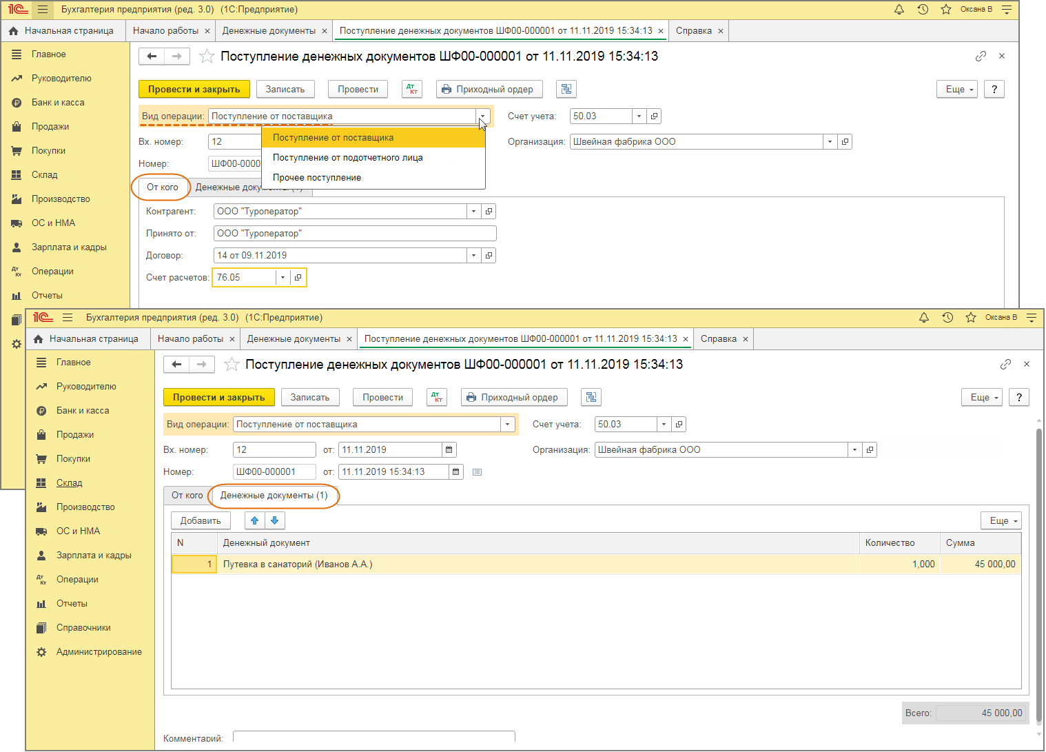 Поступившие в организацию санаторные путевки могут быть приняты к учету на счет 50.03 Денежные документы с помощью документа Поступление денежных документов (рис. 1).