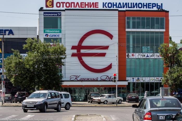 4. Грозненцы - настоящие патриоты, они очень любят Россию вообще и Чечню в частности. Но почему на одном из универмагов во всю стену красуется гигантский символ евро?